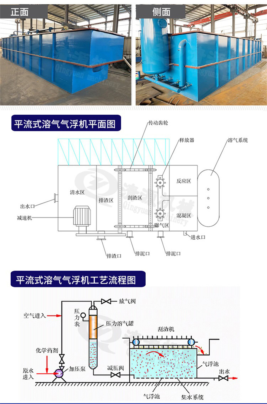 結(jié)構(gòu)特點(diǎn):設(shè)備主體為長(zhǎng)方形鋼制結(jié)構(gòu)。主要部件由溶氣泵、空壓機(jī)、溶氣罐、長(zhǎng)方形箱體、氣浮系統(tǒng)、刮泥系統(tǒng)等組成。