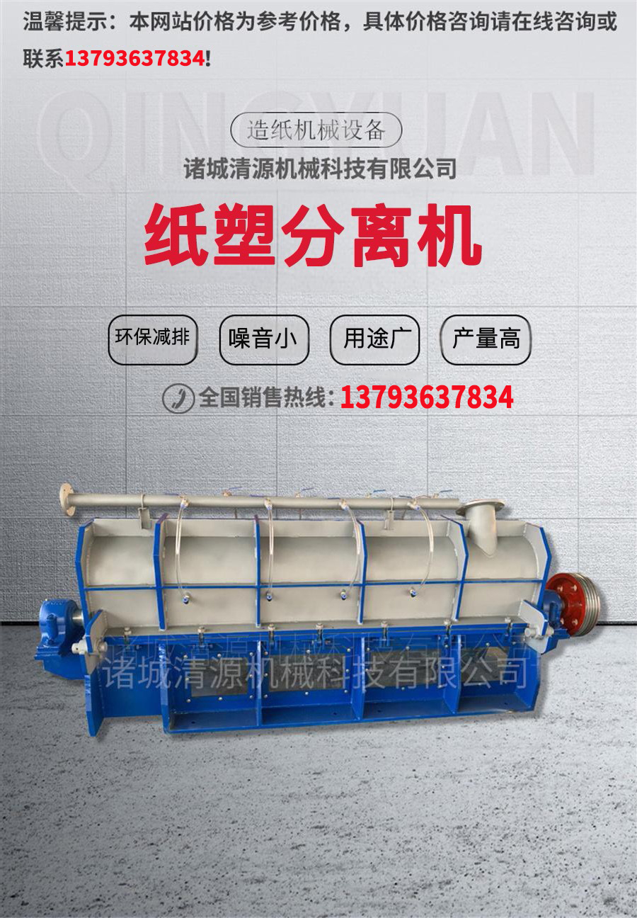 諸城清源機(jī)械生產(chǎn)的紙塑分離機(jī)包括一焊接的組裝主體,主體支撐著篩板、轉(zhuǎn)子、收集槽、渣滓排放槽和支架,它是水平安裝的。