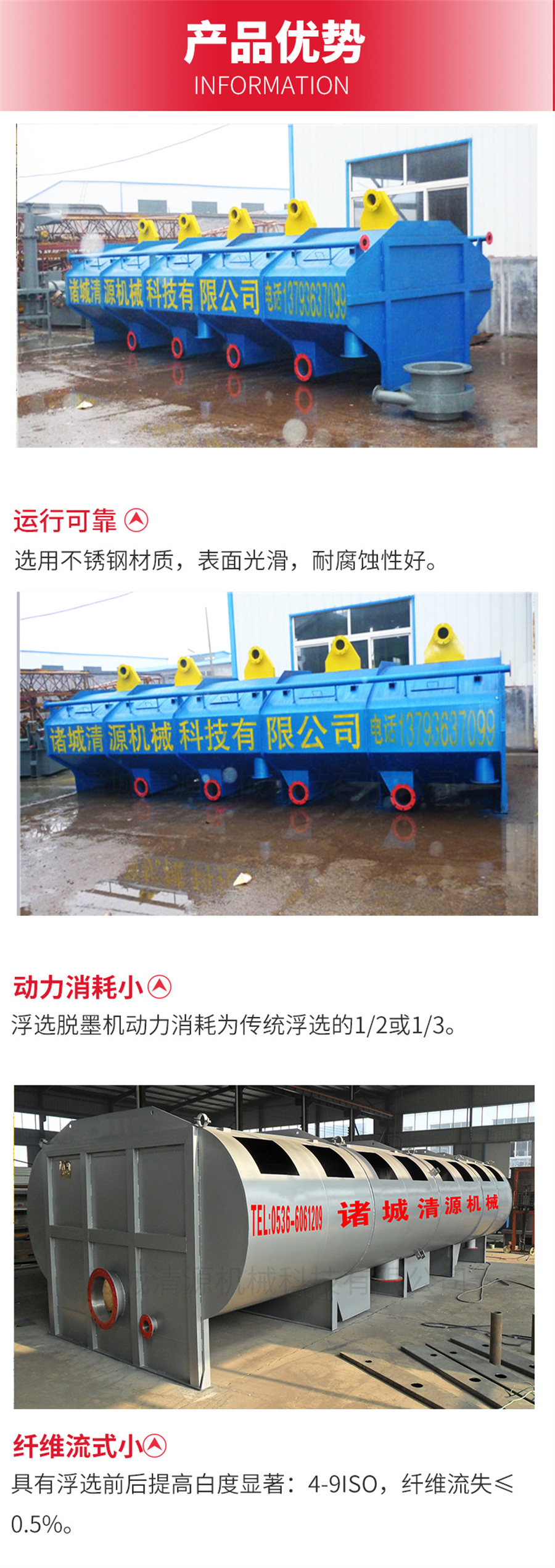 浮選脫墨機(jī)具有浮選前后提高白度顯著:4-9ISO,纖維流失≤0.5%,動(dòng)力消耗為傳統(tǒng)浮選的1/2或1/3。能夠去除油墨顆粒的尺寸范圍大,大約5-550微米。內(nèi)置式曝氣元件,有利于工藝氣體回路封閉。浮選脫墨機(jī)槽體間組合合理,液位控制簡(jiǎn)單,運(yùn)行可靠,產(chǎn)量范圍大。